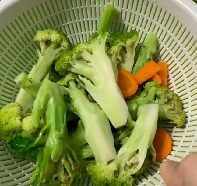 Bông cải được tách vỏ, sau đó rửa sạch và để ráo. Tiếp theo, cắt khúc bông cải xanh thành từng miếng vừa ăn.