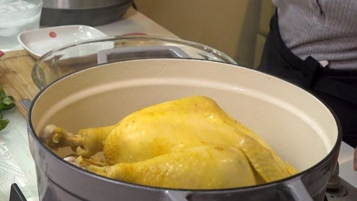 Bước đầu tiên, hãy chuẩn bị gà và luộc chín. Đặc biệt, thêm hành tím nướng và muối hạt vào nước luộc để tạo hương vị đậm đà.