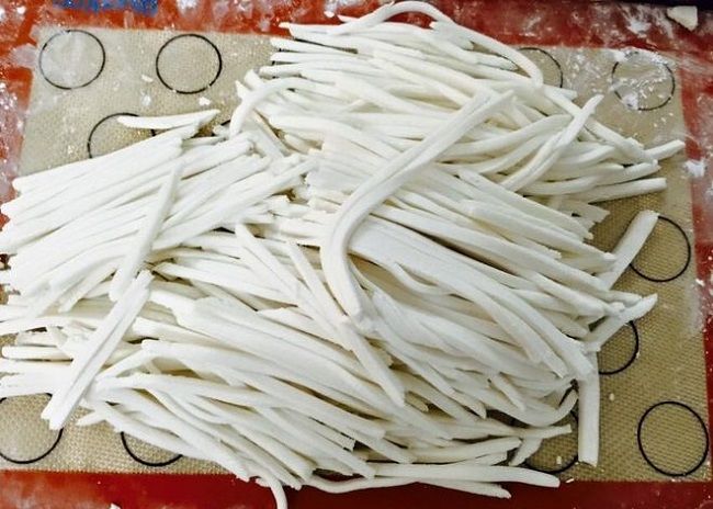 Sử dụng dao sắc để cắt bột thành từng sợi nhỏ, cho vào đĩa lớn. Cắt vừa ăn, không nên cắt quá nhỏ để tránh bánh canh bị nhão khi nấu.