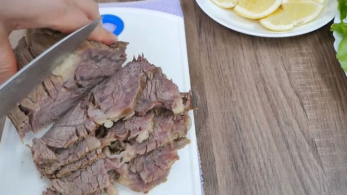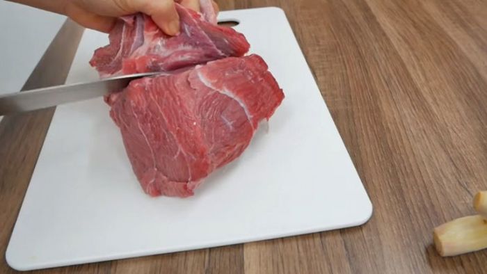 Sau khi mua thịt bò, hãy rửa sạch và chia thành hai phần. Một phần để nguyên, đặt vào nồi hầm với xương để nước dùng thêm ngọt. Phần còn lại, hãy cắt thành lát mỏng để làm bò tái.