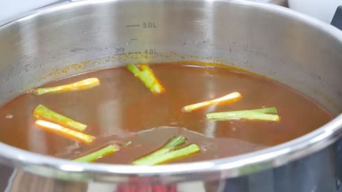 Đặt xương vào nồi với 2 lít nước, hầm xương trên lửa nhỏ trong 1 tiếng để nước xương trở nên ngọt ngào.