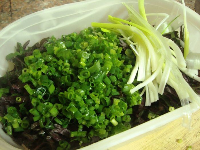 Rau răm và hành lá sau khi rửa sạch, hãy cắt nhỏ. Hành lá, hãy tách phần đầu riêng và cắt phần lá thành những đoạn nhỏ.