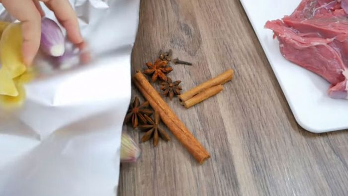 Gừng và hành tím sau khi rửa sạch vỏ, hãy bọc trong giấy bạc cùng hoa hồi và quế. Đặt trong lò và nướng ở 180 độ C trong 7 phút.
