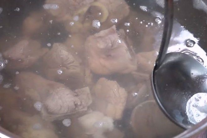 Làm sạch xương và trụng qua nước sôi để loại bỏ chất bẩn. Sau đó, nước dùng sẽ trở nên trong suốt hơn khi nấu.