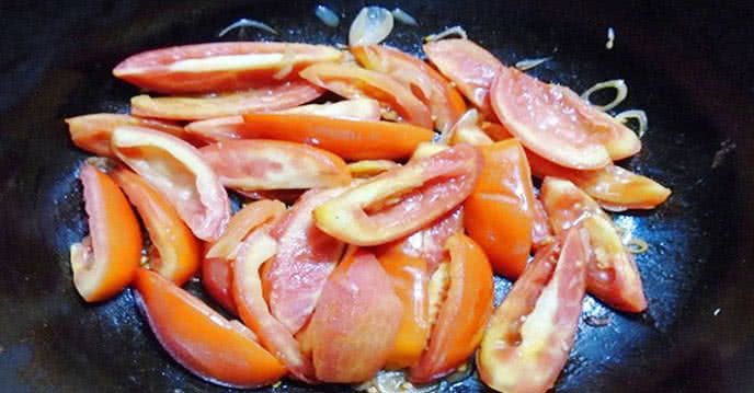 Cà chua được xào chín, nhuyễn, rồi thêm vào nước dùng để tạo màu