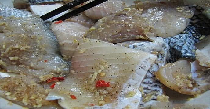 Bước 2: Cá rô phi sau khi rửa sạch, loại bỏ màng đen, thái lát mỏng và ướp với 1 chút muối, tiêu.