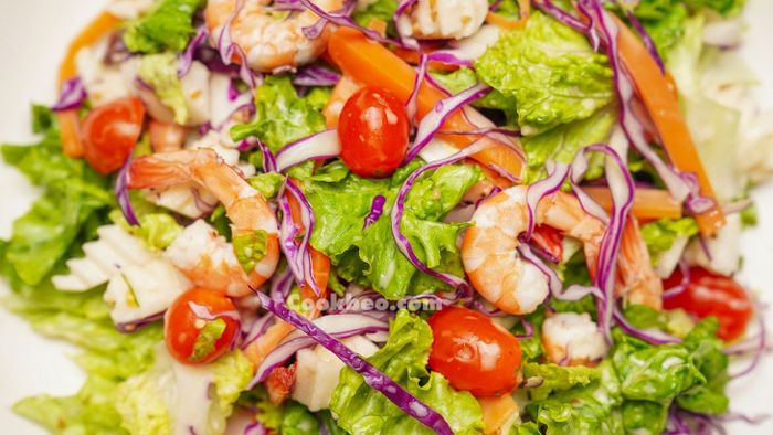 Tôm chay chín sẵn, bổ đôi, xếp lên trên bát mì.