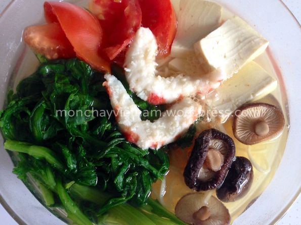 Gắp nấm hương, đồ cà chua xếp lên rồi chan canh sôi vào bát mì.