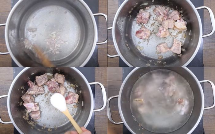 Sau khi hành tím đã thơm, thêm sườn non vào nồi và đảo đều.