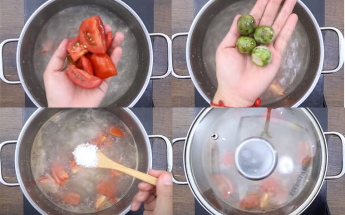 Khi nước đã sôi, thêm sấu và cà chua vào nồi, đậy nắp lại, và ninh trong khoảng 25 phút.