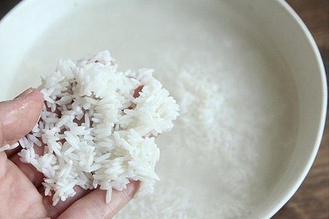 Gạo tẻ được vo sạch, ngâm nước để làm mềm và thơm hơn. Sau đó, ninh chín trong nồi áp suất với nước để có gạo nở chín mềm.