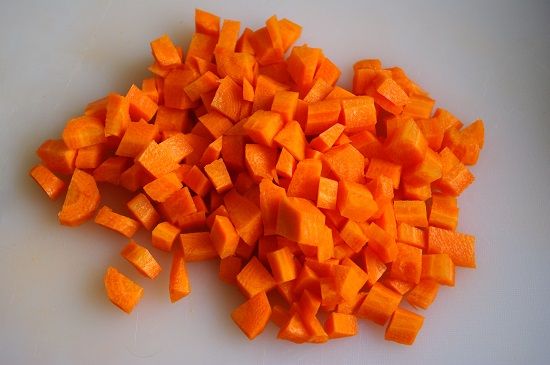 Hành lá chẻ đôi, ngò rí rửa sạch và cắt nhỏ. Cà rốt rửa sạch, sau đó cắt thành hạt lựu.