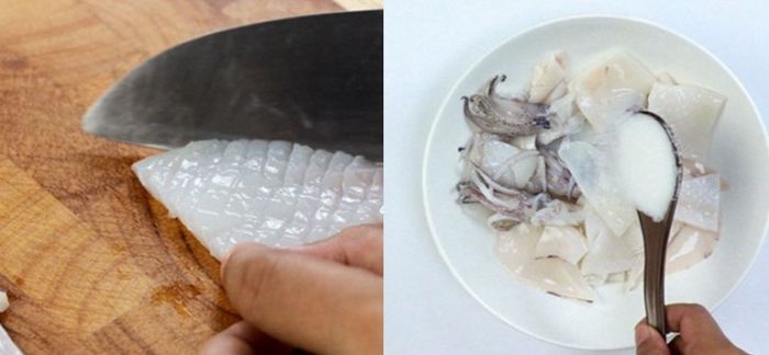 Mực được rửa sạch, lấy túi mực sau đó cắt thành từng miếng vừa ăn. Đặt mực và tôm vào bát, ướp với hành tím băm nhuyễn, đường, bột nêm, muối trong 15 phút để gia vị thấm.