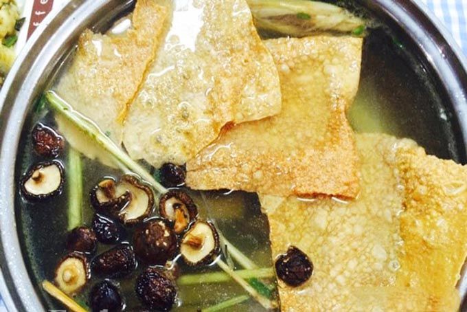– Sau đó, đổ nước lẩu vào nồi và thêm nấm hương đã ngâm nở cùng vài miếng váng đậu vào nước dùng.
