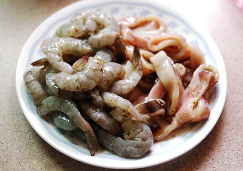 Sơ chế tôm và mực bằng cách ngâm trong nước muối 20 phút. Tôm bỏ đầu và lấy sợi đen, mực loại bỏ phần đầu rồi cắt thành từng miếng nhỏ phù hợp ăn