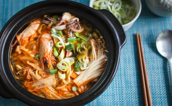 Đun sôi nước, phi thơm hành tỏi, thêm kimchi và xào. Thêm 50ml nước, ớt bột Hàn Quốc, tương ớt, đường, hạt nêm, nước kimchi. Khi sôi, thêm mực, tôm, bông cải, nấm. Đun chín mềm rồi thêm mì. Chờ mì chín là có món ngon