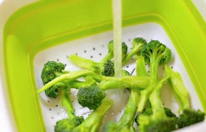 Chuẩn bị bông cải xanh, cắt nhỏ và rửa sạch; bào mỏng bắp cải tím sau đó rửa sạch