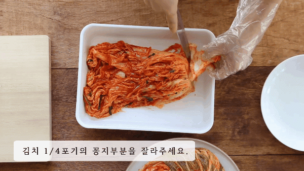 Chế biến kimchi thành từng miếng vuông nhỏ, đặt vào một bát riêng