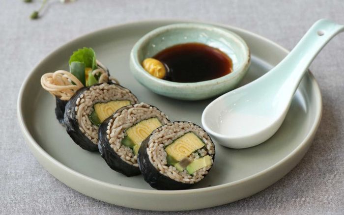 Rán trứng trong chảo nóng. Khi gần chín, cuộn trứng thành khối dài, sau đó cắt thành lát như dưa chuột. Làm mát lá rong biển bằng mành tre, đặt mì, lá tía tô, dưa chuột, trứng chiên, bơ và cuộn lại như khi làm Kimbap thông thường.