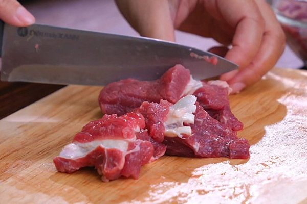 Thịt bò được mua về rửa sạch dưới vòi nước, sau đó sử dụng vài lát gừng để rửa sạch thịt và loại bỏ mùi hôi. Sau đó, thịt bò được cắt thành từng miếng vuông vừa ăn. Lưu ý cắt miếng thịt đậm và to hơn một chút vì khi nấu, thịt bò sẽ co lại.