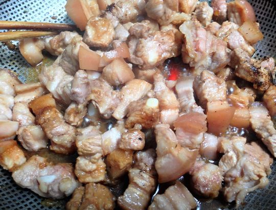 – Đặt chảo lên bếp, đổ dầu ăn, xào thịt đã ướp cho thịt săn lại. Khi thịt săn, nước cạn, thêm nửa chén nước lạnh và kho đến khi thịt chín mềm, ngấm đều gia vị.