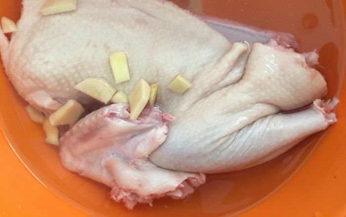 Đun nóng dầu ăn, thêm nước và thịt vịt. Nước nên ngập thịt, đun sôi và thêm một vài lát gừng để tạo hương thơm, nấu trong 30 phút ở lửa vừa.