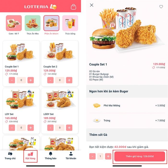 Bước 3: Chọn mục Đặt hàng > Chọn đồ ăn bạn muốn > Thêm vào giỏ hàng.