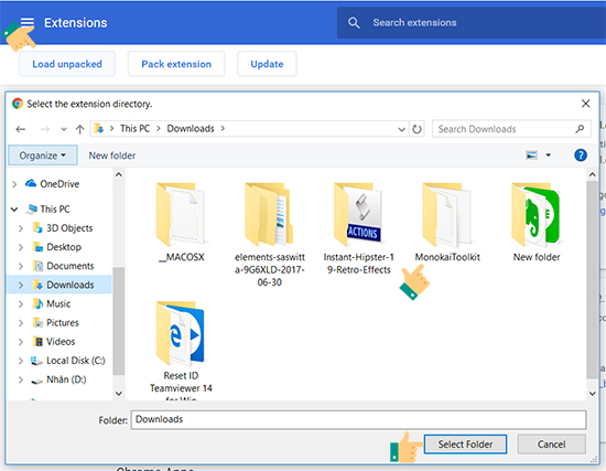 Bước 4: Nhấn vào 'Load unpacked', chọn thư mục MonokaiToolkit, và bấm 'Select Folder' để tiến hành cài đặt.