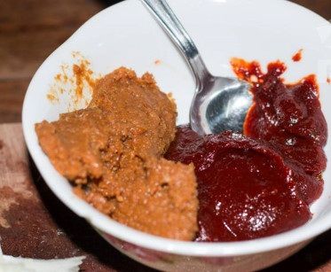 Chuẩn bị một bát lớn, trộn tương đậu, tương ớt, dầu mè, hành tỏi băm nhuyễn, và vừng đã rang chín. Nêm thêm đường, trộn đều cho hỗn hợp có màu đỏ nổi bật.