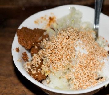 Với tương đậu, xay nhuyễn bằng cối xay. Tỏi sau khi băm nhuyễn, hành tây cũng được băm nhuyễn kèm theo. Vừng rang chín vàng trên chảo ở lửa nhỏ.