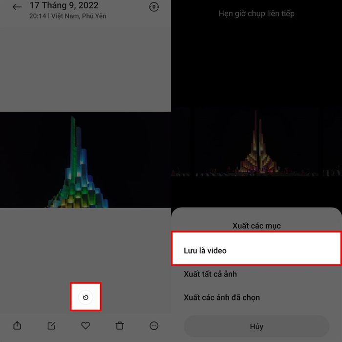 Bước 3: Khi hoàn tất quá trình chụp, vào phần Thư viện ảnh, nhận biết các ảnh chụp liên tục qua dấu Hẹn giờ chụp bên trái. Chọn ảnh đó, tiếp tục vào biểu tượng hẹn giờ xuất hiện bên dưới, sau đó chọn dấu tick và Lưu là video để có video Time-lapse.