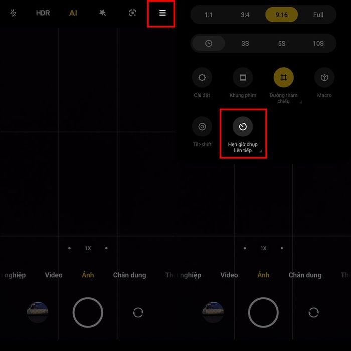Bước 1: Mở camera điện thoại, chọn menu ở góc trên bên phải màn hình. Tại Hẹn giờ chụp liên tiếp, ấn vào mũi tên dưới để truy cập phần điều chỉnh thời gian chụp ảnh.