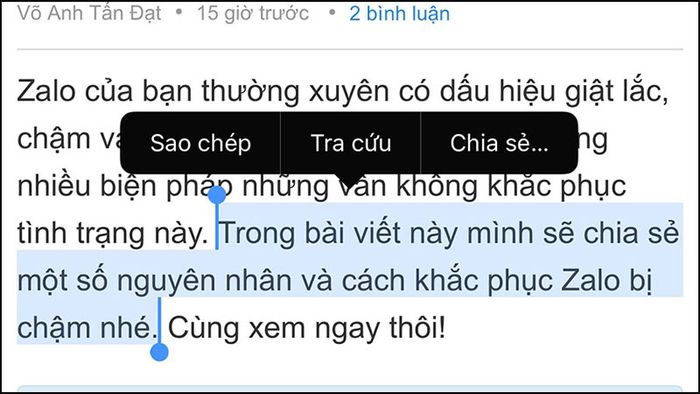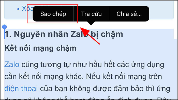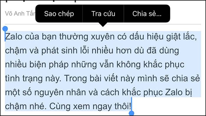 Bước 2: Kéo thanh kéo chọn đoạn văn bản cần sao chép (có thể bao gồm cả văn bản và hình ảnh) > Chọn Sao chép (Copy) trên thanh màu đen.
