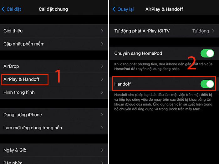 Vào ứng dụng Cài đặt trên điện thoại > Chọn Cài đặt chung > Chọn AirPlay & Handoff > Bật Handoff.