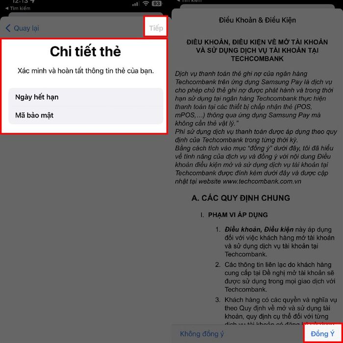 Bước 3: Nhập thông tin cơ bản về số thẻ, chủ thẻ và ấn ngay Tiếp. Nhập thời hạn và mã bảo mật (Mã CVV) > ấn Tiếp. Đọc và đồng ý với điều khoản sử dụng Apple Pay.