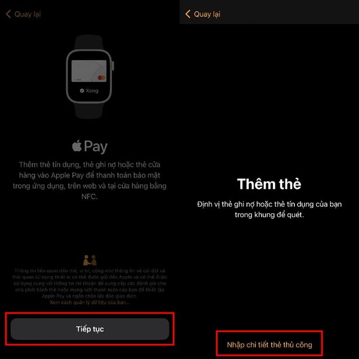 Bước 2: Đọc và ấn Tiếp tục, sau đó nhập thông tin thẻ bằng cách quét hoặc nhập thủ công. Đơn giản như vậy bạn đã có thể sử dụng Apple Pay trên Apple Watch.