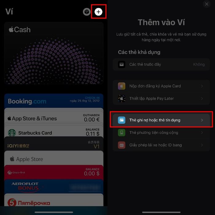 Bước 1: Mở ứng dụng Ví trên iPhone, chọn dấu +, thêm thẻ ghi nợ hoặc thẻ tín dụng.