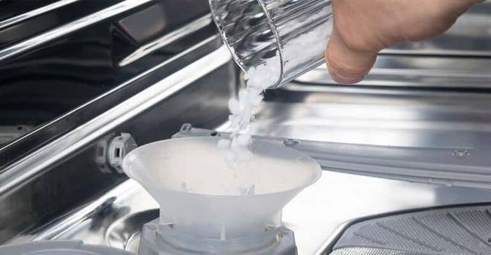 Nếu muối bị đổ ra ngoài khi thêm vào hộp, hãy vệ sinh kỹ càng để tránh bát đĩa có vị mặn do muối. Bạn có thể lau sạch bằng khăn mềm thấm nước hoặc bật chu trình rửa nhanh trên máy để làm sạch muối rơi ra ngoài.