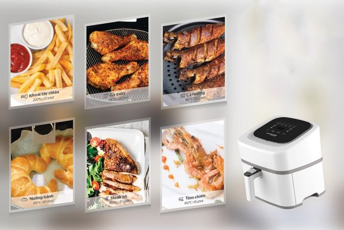 Thiết bị sẽ tự động đề xuất thời gian và nhiệt độ nấu dựa trên thực đơn bạn lựa chọn.