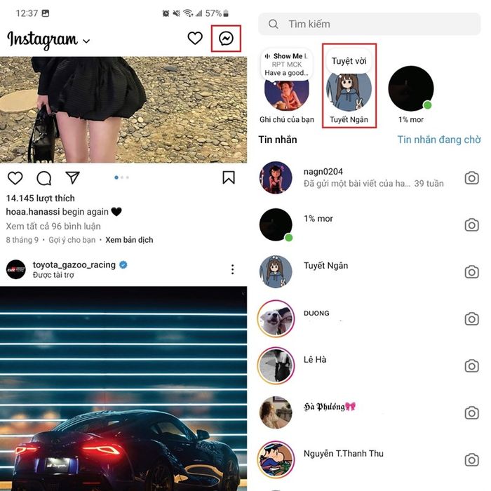 Bước 1: Trên trang chính của Instagram, chọn biểu tượng Tin nhắn > Giữ ảnh đại diện của tài khoản bạn muốn chặn trong ghi chú.