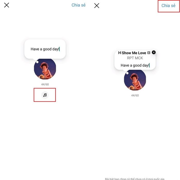 Bước thứ 3: Hoặc bạn có thể thêm một bản nhạc phù hợp bằng cách bấm vào biểu tượng Âm nhạc và chọn một bài hát bạn thích > Cuối cùng, nhấn nút Chia sẻ để kết thúc.