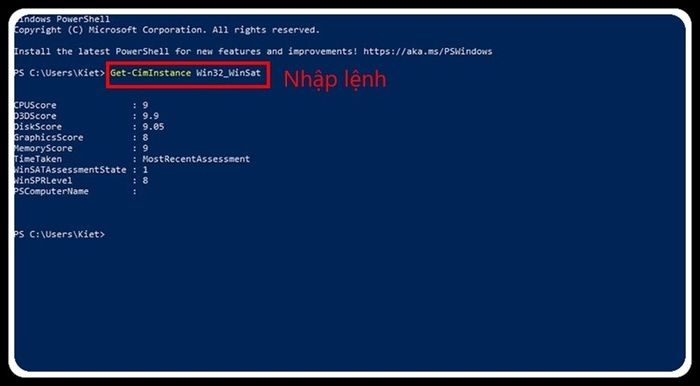 Bước 2: Gõ lệnh PowerShell sau đây: Get-CimInstance Win32_Winsat và nhấn Enter.
