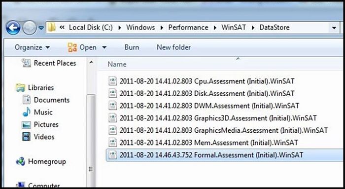 Bước 1: Mở thư mục C:\Windows\Performance\WinSAT\DataStore. Tìm file có đuôi là Formal.Assessment (Initial).WinSAT ở ngày tháng gần nhất.