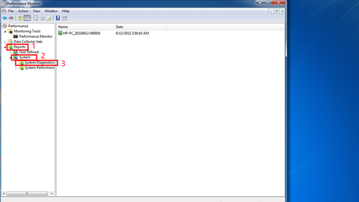 Bước 2: Mở rộng mục Reports > System > System Diagnostics ở cột bên trái của Performance Monitor.