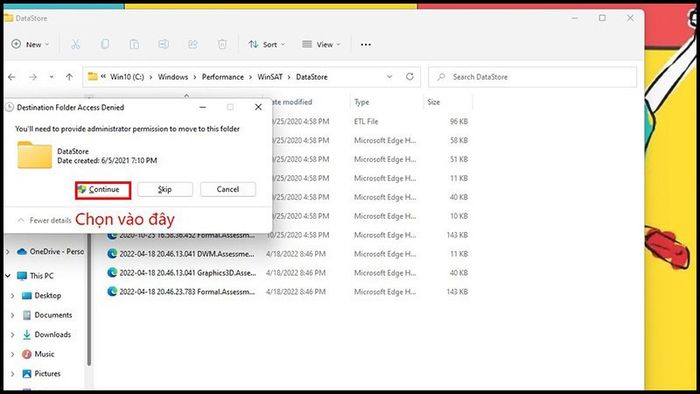 Bước 5: Chép file này vào đường dẫn C:\Windows\Performance\WinSAT\DataStore. Bấm Continue nếu có thông báo.