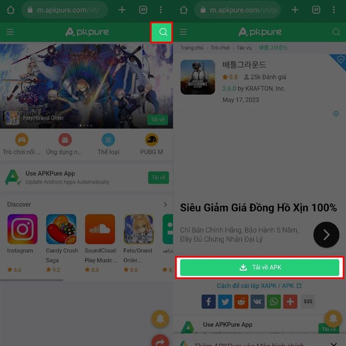 Bước 2: Khi đã truy cập thành công vào trang chính của APKPure, để tìm và tải ứng dụng bạn muốn, bạn chỉ cần nhấn vào ô tìm kiếm và nhập tên ứng dụng bạn cần. Sau đó, chọn ứng dụng và nhấn vào nút Tải về APK màu xanh dưới ứng dụng.