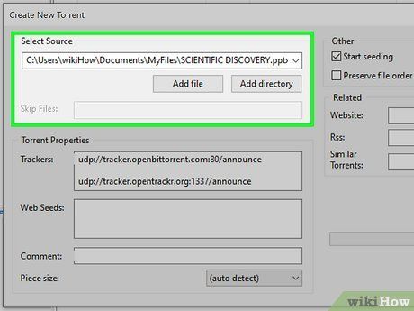 Thêm tập tin. Dùng nút 'Add File' (Thêm Tập tin) và 'Add Directory' (Thêm Thư mục) để chọn tập tin muốn thêm vào torrent.
