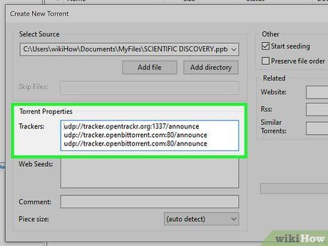 Thêm tracker. Trong phần Torrent Properties (Đặc tính Torrent), nhập địa chỉ tracker muốn chia sẻ torrent.