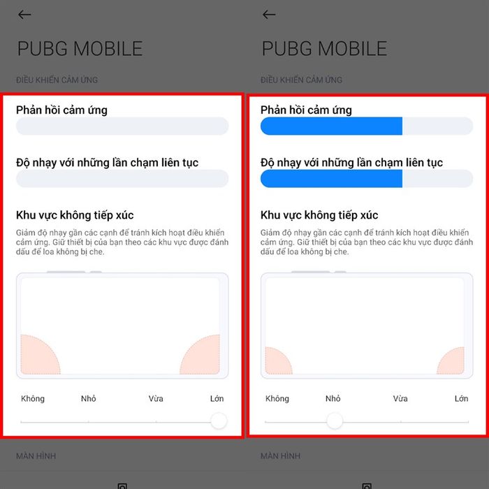 Bước 3: Điều chỉnh Phản hồi cảm ứng và Độ nhạy với những lần chạm liên tục lên mức cao để tăng độ nhạy cảm ứng khi chơi game. Hãy nhớ giảm Khu vực không tiếp xúc để tránh chạm nhầm.