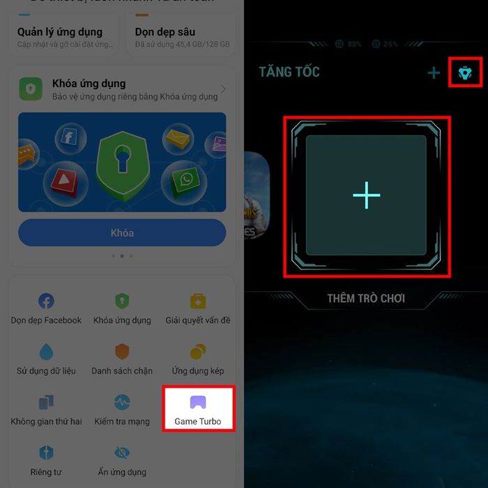 Bước 1: Mở ứng dụng Bảo mật > Game Turbo. Nếu trong Game Turbo có sẵn game bạn muốn điều chỉnh, nhấn vào biểu tượng cài đặt ở góc trên bên phải màn hình. Nếu chưa có, thêm game vào Game Turbo bằng cách nhấn dấu +.